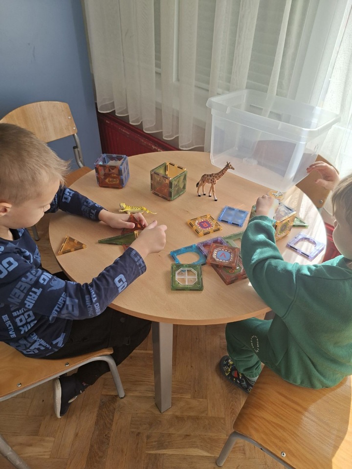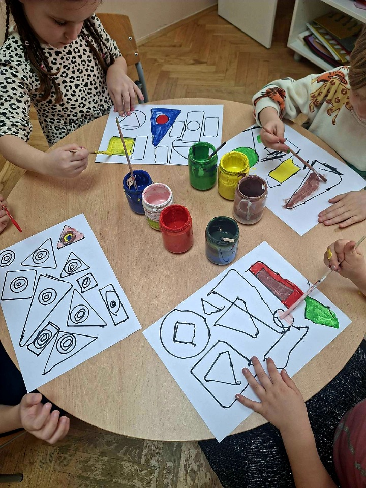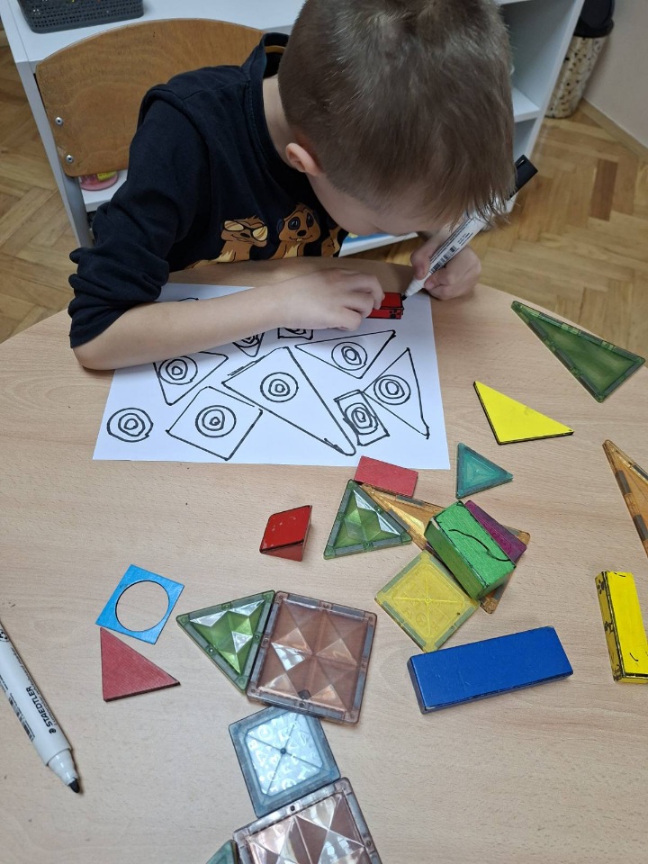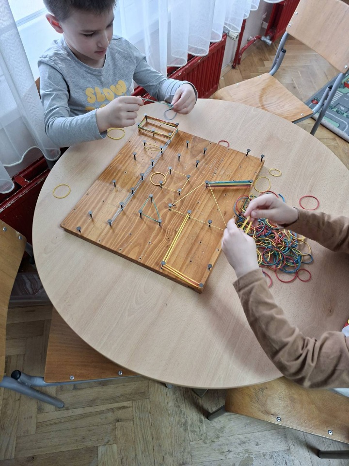 Uz likovno izražavanje, djeca su kroz igru i manipulaciju didaktičkim materijalima prepoznavala i imenovala osnovne geometrijske oblike poput kruga, trokuta, kvadrata i pravokutnika. Slaganjem oblika, građenjem konstrukcija i korištenjem ploče s gumicama razvijali su prostornu percepciju, logičko razmišljanje i preciznost.