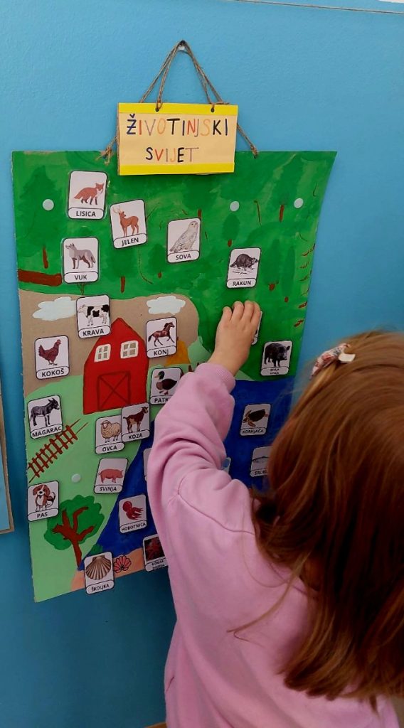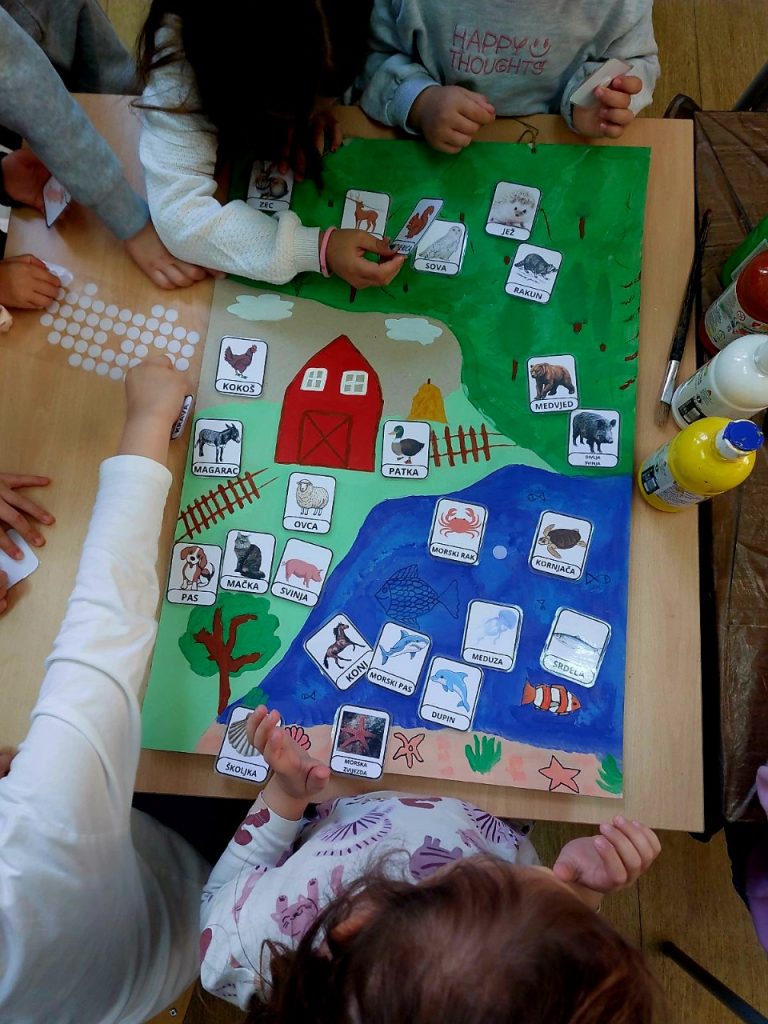 Djeca su aktivno sudjelovala u izradi tematskog panoa pri čemu su razvrstavala i smještala životinje u odgovarajuća okruženja (šuma, selo/farma i more). Ovakav oblik rada poticao je logičko razmišljanje, razvoj predčitalačkih vještina (prepoznavanje i povezivanje pojma sa slikom) te bogaćenje rječnika.